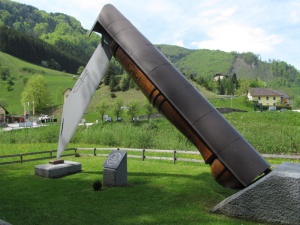 Schon kurz vor dem Ort weist eine riesige "Taschenfeitl" auf den früheren Erwerbszweig hin. Ein Lehrpfad führt auf einen Abstecher durch das in einem Seitental gelegene Dorf.