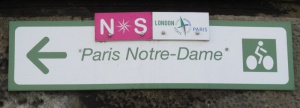 Das erste Schild der Avenue verte findet man direkt vor der Kathedrale Notre-Dame. Innerhalb von Paris ist die Beschilderung aber noch sehr lückenhaft, und die vorgesehene Route auch nicht zweckmäßig, u.a. führt sie kilometerlang durch eine überlaufene Fußgängerzone. Deshalb wird im Folgenden eine unbeschilderte Route beschrieben, wie sie auch für Paris - Straßburg verwendet wird, wie folgt: