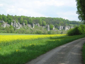 Zunächst entlang der Bahnlinie, dann ein kurzes Stück entlang der B43 und von hier aus an der nächsten Kreuzung auf der Straße nach links in Richtung Bischofsheim abbiegen. Weiterfahrt auf der Straße bis in das Ortszentrum. Wen die Fahrt entlang der Bundesstraße nicht stört, kann auch einfach geradeaus weiterfahren und auf diese Weise die Strecke etwas abkürzen und Bischofsheim umfahren.
