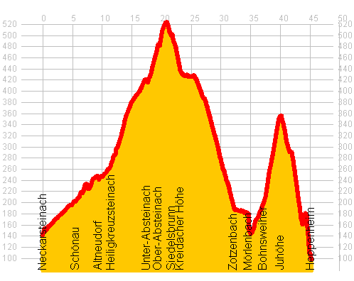 | 18:59, 12. Sep. 2016 | Neckar - Bergstraße.png (Datei) | 8 KB | Jmages | == Beschreibung == Standardisiertes Höhenprofil * Höhenmeter: 20 m Unterteilung (16 Pixel pro 20 m) * Streckenlänge: 5 km Unterteilung (42 Pixel pro 5 km) == Lizenz == {{cc-by-sa}} | 1 | |