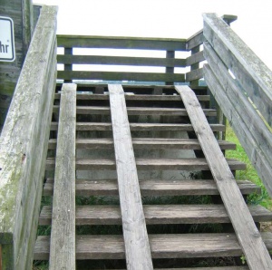 - Am nördlichen Ortsrand muss eine Brücke überquert werden, deren schmale Fahrrinnen für viele Radler mit schwerbepackten Rädern zu steil sind. Eine doppelte Spurrinne für Kinderanhänger fehlt. Ein Tragen/ Abpacken ist für viele Radler unumgänglich. Alternativ könnte die Strecke über die Brücke am Maschmühlenweg, links auf Im Rinschenrott, unter dem Autobahnzubringer hindurch auf der Straße Richtung Kompostwerk geführt werden. Nicht schön, aber zumindest sicher und barrierefrei.