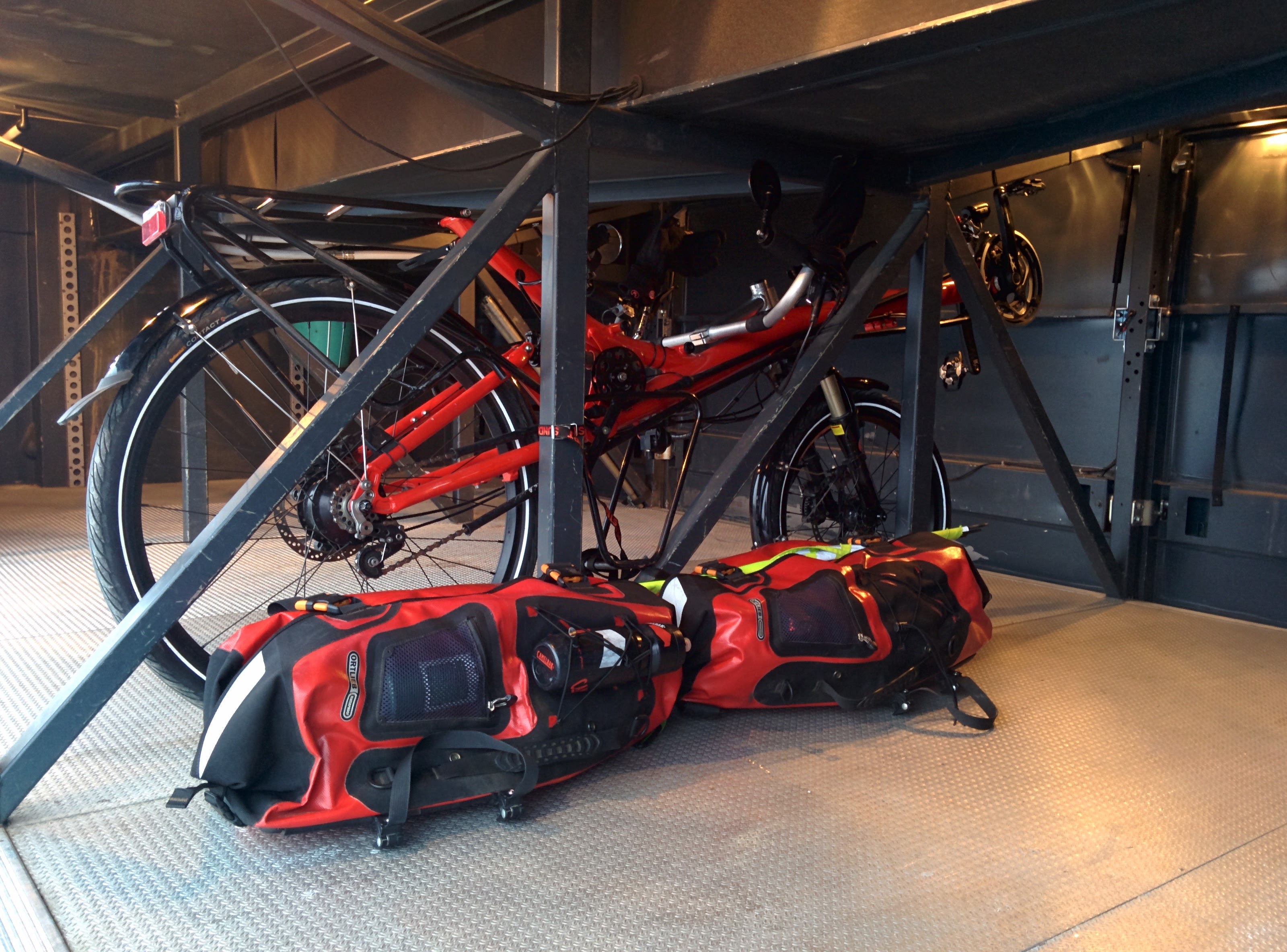 Liegerad HP Streetmachine im Kofferraum des Esklisen-Linienbusses Nordkap-Rovaniemi, mit Gurten verzurrt an den Holmen