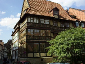 Wir stehen vor der romanischen Basilika St. Godehard von 1172, Grablege Bischof Godehards, nach dem der Gotthardpass in der Schweiz benannt ist. Die Straßenzüge in diesem Viertel sind die einzigen, die die Zerstörung Hildesheims im Jahre 1945 überstanden haben. Gegenüber der Godehardikirche, an der Ecke Hinterer Brühl, steht das Wernersche Haus von 1606.