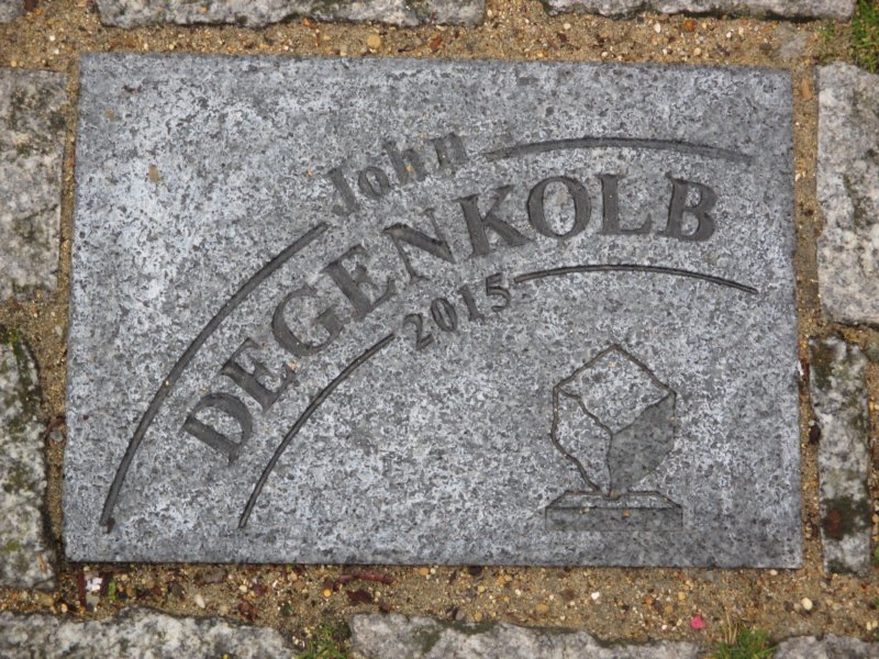 Pflasterstein mit dem Namen John Degenkolbs auf dem Espace Croupelandt, Zielgerade von Paris-Roubaix